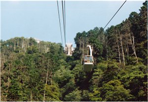 8月8日 旭川空港より名古屋空港へ。空港でさっそく名物「みそかつ」を食べる。「めちゃめちゃうまい」とまでは言わないが、なかなかいける。お腹を満たしたところでレンタカーを借り、まずは名古屋城へ。大河ドラマの記念展が開かれていた。なかなか見ごたえがある城だ。それにしてもやはり名古屋は暑い。 その後まだ時間が早いということで岐阜城を見に行く。ロープウェイに乗って、その後歩くこと10分強。戦国時代、特に織田信長が好きな私にとっては興味津々だったが。「これが岐阜城か。」という小さな山城で、何となくイメージが崩れる。しかし、よくこんなところに作ったものだ。 名古屋に戻りチェックイン(名古屋マリオットアソシアホテル)。今年できたばかりの超高層ホテルだが18階の部屋でやや不満。もう少し上に泊まりたかった。ちょっと休むと急に雷雨。ものすごい勢いで降り続け、雷もあんなに長くなっているのを初めて見る。しかも、隣のビルの屋上にある旗に落ちた!落ちた瞬間というものを初めて見て感動する。翌日になって大変な被害が出たことを知る。 ↓ 岐阜城に上るためのロープウェイ。この後さらに徒歩で登る。 |
