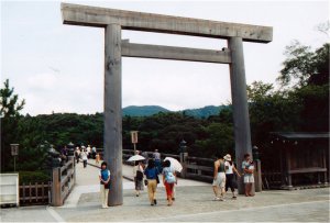 8月9日 ホテルをチェックアウト後すぐに都市高速に入り、そのまま東名阪自動車道、伊勢自動車道で伊勢へ。特に信心深いわけではないけれど、せっかくここまで来たのだから、ということで伊勢神宮へ。外宮、内宮の順にお参りし(内宮は鳥居からかなり歩く)、その後名物「赤福」をいただく。これが余り期待していなかったのに反して非常にうまい!もち&あんこ系のお菓子であんなに美味しいのは初めて。「名物にうまいものなし」はやっぱり嘘だ。その他松阪牛の串焼きと、伊勢うどんを食べる。伊勢うどんはとても濃い色だけれどなかなか美味しい。 その後鳥羽に向かい「ジュゴン」を見るために鳥羽水族館へ。入場料の高いのに驚く。たかだか水族館で大人2400円は暴利だ。しかもジュゴンだって「ふうーん」という程度。ちょっと残念。夫婦岩を経由して宿へ到着。貸し切り露天風呂があるというので行ってみると、露天風呂付きカラオケボックスという感じだった。せっかくだから唄ったりお湯に浸かったり。部屋には冷蔵庫があり、中にはビールが入っている。「いいのかなぁ」と思いながら、請求されたら払えばいいということで飲んだビールは美味しかった。 |