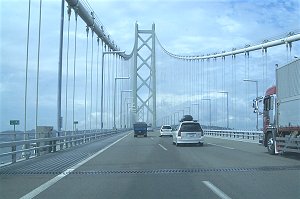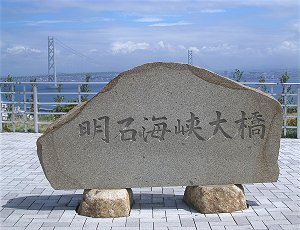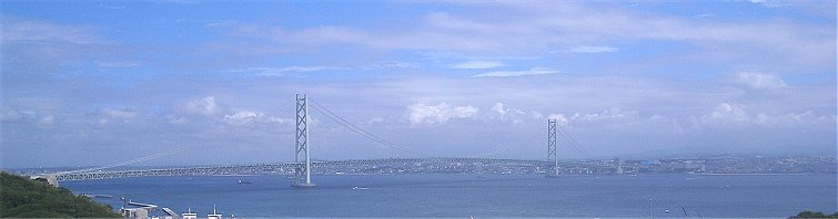 ![]() ↑ いざ明石海峡大橋へ。車から妻が撮影。 ![]() ↑ 淡路SAの展望場所で。小さく見えるが幅2mくらいの石だ。 ↓ 大橋全景。SAから出ればもう少し近くで見られるのかもしれない。 |