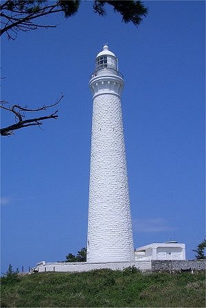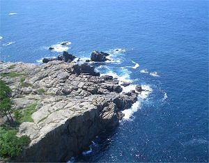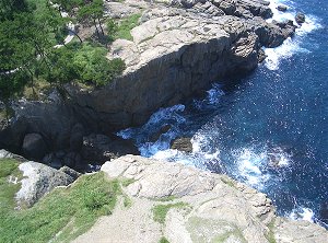 | しまった)上り一番上へ。外に出てみると目がくらむような高さだ。手すりの最上部が足元よりも外側に出ているような作り方が何となく怖くて端の方には近寄りがたい感じだ。しかし、そこから見る日本海の景色は、快晴に近いような晴天にも助けられてとても美しく、「ここまで来て良かった」と思わせるものだった。しかし、遠くの景色を撮影するのはともかく、真下の方向を写すにはやはり手すりの端の方まで行かなくてはならず、おそるおそる写したのが下の写真だ。 ↓ 灯台最上部から眼下を写す。海の色が濃い。 快晴の空に映える真っ白な灯台→ |