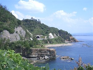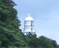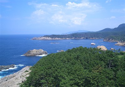 | 出雲大社の後は「日御碕」をめざす。夕陽がきれいなところ、ということなのだが、そんな時間まで待っていられない。海岸線の絶壁に作られたような道路を走り岬に着いたら白い灯台がそびえている。海岸線を見るつもりで近づいていくと灯台に上れるようだ。内部の螺旋階段を160段ほど(階段に書いてあったのだが途中で見るのを忘れて | |