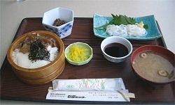 さて、一路青海島へ向かったが、あまり天気が良くなくて、ボートなどに乗らなければ景色もそれほどでないようだ。そんなわけでここでは昼食に専念する。「ウニ釜飯」で有名らしい店に入り食べることにする。私はウニがあまり好きではないので「中トロ鉄火丼」を食べ、妻が「生ウニ釜飯」を食べることに。釜飯だから火を通すのになぜ「生ウニ」なのかと思ったら、ウニ入りの釜飯の上に生ウニがどーんと載っているのだ。なるほど、と納得する。この日は「土用の丑」だったので、ついでにウナギの蒲焼きも食べておいた。 |