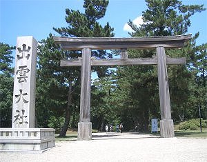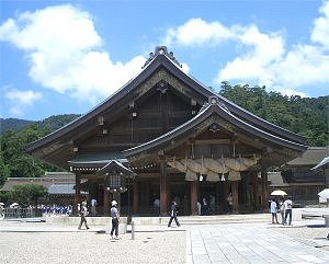 8月3日 今日は今回の旅行のメインの一つである「出雲大社」だ。前日の天気予報では、午前中は雨で午後から曇り、ということだったのだが、チェックアウトして間もない時間から晴れてきて、出雲大社に着いたときには素晴らしい好天だった。 それにしても、津和野を出発して、地図上では益田で日本海沿線に出てその後ずっと海岸線を走る感じなのだが、実際はほとんど海を見ることができない。街並みに入るときに時々海が見えるだけで、その他はほとんど山の中を走っているという印象だった。それだけ海岸線には平地部分がないのだろう。 出雲大社に到着する前にまず「旧大社駅」に立ち寄った。昔のJRの駅舎がそのまま保存されていて、切符売り場などは私が知らないような昔の造りだった。今時あんな状態で保存されているのはとても珍しいと思われる。非常に貴重だ。 その後いよいよ出雲大社だが、駐車場が正門と反対側にあったので、鳥居は参拝してから行くことになってしまった。途中には出雲神話にまつわる銅像のようなものもあって(詳しくはよく知らないが)、鳥居から神社まではけっこう距離があり、順番が変だったために歩く距離が長くなったが、途中の参道もなかなか趣がある。ちなみに、恥ずかしながら、ここが縁結びの神様だということを初めて知った。
