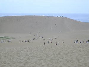 ![]() ↑ リフトを降りたところから砂丘を見る。前方の丘はけっこう高いが、 それを登らなければ海が見えないのでみんな頑張って登る。 |