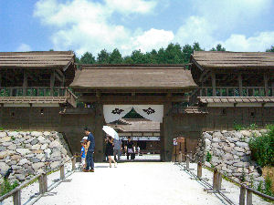 8月5日 前日寝る段階での天気予報ではイマイチで、朝起きたときもどんよりしている感じでちょっと残念に感じながらの朝食(ホテルの印象はそれ程良くもないのだが、朝食のご飯が美味しかったので好感度がけっこうアップした)だったのだが、旭川と同じ盆地特有の天気のようで、出かけるときには晴れて暑いくらいになった。まずは、時間の関係で昨日省略した「甲斐善光寺」「武田神社」へ行かなければならないので早めに行動を開始する。善光寺は時間が早いこともあるのか人が少ない。一度は本尊が祭られたとは言っても今はやはり「本家」ではないのだから仕方がないのかもしれない。それに比べると武田神社には多くの人がいた。やはり自分たちだけではなくNHK大河ドラマの影響なのか、直接武田信玄に関係するところには人が多いのかもしれない。その後「武田信玄公の墓」に寄ってみたが、こちらは誰も人がいなかった。ナビがなければ行けなかったかもしれない。早めに行動したこともあり、あまり時間のことを考えずにのんびりと行動したが、もう見るところもなく次へ移動だ。 次は北杜市の「風林火山館」というまさしく今年の大河ドラマのロケに使われたセットに向かう。前日の「風林火山博」がちょっと物足りない感じで終わったので期待していったのだが、行ってみると入場料が安い(300円)。今までの経験上、入場料があまり安いと内容もそれに比例、ということが多かったのでここはどうかなと思ったが、やはりそれなりのものであった。テレビ撮影のためだけに作成した物としては造りもしっかりしていて立派なものだが、 |