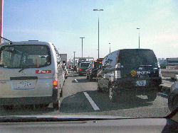 順調に走って、常磐自動車道から首都高へ。6号三郷線から中央環状線と分岐して向島線に入ってまもなくだった。「江戸橋JCTまで6km渋滞」という表示が出た。それでもしばらくは流れていたのだが、両国付近でついに車がストップした。以前、京都から伊丹空港に向かうときに47kmの渋滞に遭って飛行機に乗れなかったという経験をしているが、今回はそんなに距離はないし、かなり余裕を持ってきているから大丈夫だろう、とタカをくくっていたのだが、車はいっこうに進まない。最初は左のような写真を撮っていたのだが、徐々にそんな余裕もなくなり、いよいよこのままでは間に合わなくなりそうになってきたのだ。 間に合わなかったらシャレにならないので、レンタカーを近いところで返して電車等で空港に向かうことにして営業所に連絡する。一番近い営業所は水天宮というところにあり、箱崎ICから出るとすぐだそうだ。ところがその箱崎ICがなかなか近づいてこない。結局車がストップしてから箱崎ICまでのわずか2kmに何と1時間半もかかることになってしまった。一般道に出てからはナビを頼り何とか営業所に到着。どうやって行ったら一番早いかと聞いてもイマイチ要領を得ないが言われた通り、半蔵門線で乗り換えて、という方法をとろうと水天宮駅に行って駅員に聞いたら、人形町駅から浅草線で空港直通の京急線に乗る方が良いと言われて、そちらに急ぐ。結構距離があり、はじめからわかっていたらタクシーに乗ったのに、と思いながら重い荷物を持って汗だくになりながら何とか電車に乗り込む。時間的には結構ギリギリだ。だんだんと4年前の悪夢が頭によみがえってくるが、電車に乗ってしま |