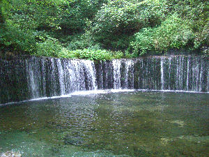 | この後は川中島の戦いで信玄の本陣となった海津城跡(その後松代城となった)に行ったが、天主以外の部分が復元されているものの、門をくぐるとただの芝生公園という感じですぐに見学が終わってしまった。真田宝物館は定休日で、食事をしただけでこの地を離れる。 ↓ 軽井沢からの白糸ハイランドウェイにある「白糸の滝」 | |
