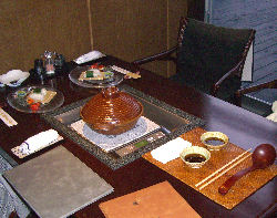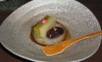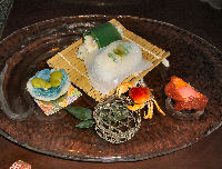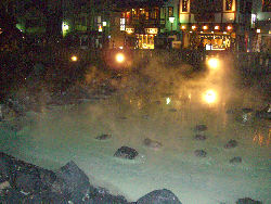 として人気が出るだろうに、ともったいない感じであった。食後は、せっかく気分が良くなったのにあの部屋では…ということで夜の湯畑を見に外に出る。するととても人が多い。周りにある土産店にもたくさんの人がいてとても活気がある。店に入って何かないかと物色したり、湯畑の横にある「足湯」入ったりして部屋に戻り、明日に備えて就寝。食事だけは満足できるホテルだった。 ↑和風のワインクーラーに入ったシャブリ ← 前菜(左上)に始まり、デザート(右下)までのコース料理の数々 → ↓ 入り口から見た雰囲気も良い 夜の湯畑 ↓ |
