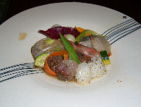 に期待したが、内湯も露天も狭い風呂でこれもちょっとがっかりだ(お湯の質はよいのだが…)。そんなわけで残る期待は夕食だ。今回の宿泊プランは部屋食でもバイキングでもなく、食事処で創作料理というもので、これがダメだったら「草津はダメ」という印象で終わるところだったが、この「宙の鑑(そらのかがみ)」という食事処が、雰囲気も良く、そして料理も全て満足できるものであった。コース料理なのだが、メインの料理ともう一品が2種類から選ぶことができて、2人で別なものを注文したので非常にたくさんの種類を味わうことができた。我々が入った部屋は外のバルコニーのようなところに出られるようになっており、後で調べるとそこで食事をすることもできるようだ。ただし、外は部屋ごとのしきりがないので落ち着かないかもしれない。この食事処の大きな特徴として、お酒のメニューが驚くくらいたくさんあることだ。日本酒(全国の地酒もある)や焼酎がたくさんあるのはもちろんのこと、ワインもたくさんあって、値段も比較的リーズナブルである。今年は銀婚旅行であるわりには、ここまであまり贅沢していないので、奮発して「シャブリ」を飲むことにしたのだが、これが何と5000円で非常に特をした気分であった(後で調べると、ルームサービスで頼んでも同じ値段であった)。翌日の朝食もなかなかで、これだけ食事に力を入れるなら、部屋と大浴場を大改装すれば高級ホテル