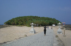 ![]() ↑ 橋を渡って青島へ。遠くに鳥居が見える ![]() |