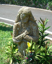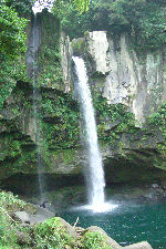 があると必ず行くことになっている。ひなびた湯治場だから仕方がないのかもしれないが、スピードを落として走らなければ気がつかないで走り去ってしまうような、観光客もいなくて淋しいところだった。犬飼の滝は、道路脇の駐車場からでも一応見ることができるが、伊豆の「浄蓮の滝」と同じような道をかなり下っていかなければ見るべきポイントに行けない。やはり「せっかくだから」下まで降りてみるが、帰りがかなりの登りということになり、ここでけっこう汗をかく。滝自体は浄蓮の滝よりも迫力がある感じだが、とにかく人がいなくて淋しい。 |