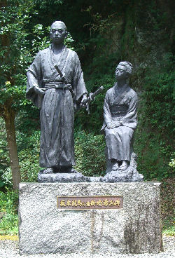 | その後はしばらく海岸線を走り、隼人というところから内陸に入る。鹿児島空港の横を通過して、塩浸温泉の「龍馬とおりょう新婚旅行の碑」、「犬飼の滝」と周り、「霧島神宮」で鹿児島観光の最後だ。まずは龍馬の石碑へ。坂本龍馬は今回は直接関係がないのだが(まったくないわけでもない)、妻が龍馬ファンなので、龍馬に関するもの | ||