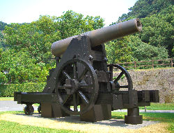 ちなみに、クリスタルグラスのカットは好きなのだが「切子」と呼ばれる色付きのカットグラスはあまり好みでない。しかし、ここの「薩摩切子」はなかなか素晴らしい。「これはいい」と思う物はちょっとしたグラスでも4〜5万円もするのには驚いたが…。この「尚古集成館」でしか買えません、というものが良い物なのだが、いくら限定に弱い自分でも高くて手が出ないし、手が出る物はそれほど欲しいとも思わない。なかなかうまい具合にいかないものだ。 | ↓ 鉄製150ポンド砲。なかなか大きい。![]() |