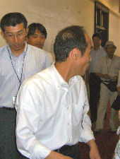 | だけの青島にも行ってみる。青島で見たかったのは「鬼の洗濯岩」で、高知県の竜串海岸同様に不思議な景色だ。自然の力というのはおもしろい。その後、海水浴客が食べるかき氷につられて、マンゴーとパイナップルのアイスを食べて青島を後にする。そういえばここにも何やら由緒正しそうな神社があった。名前は「青島神社」でそのまんまで、今は橋があって歩いていけるがそもそもは「島」だ。なぜこんなところに神社を造ったのだろうか。それでもせっかくだから拝んではきたのだが…。 県庁に行き、駐車場に入るのに時間がかかったりしたのだが、そ れが幸いしてちょうど知事が庁舎の別のところから知事執務室へ戻ってくるところに遭遇した。そして幸運にも握手してもらうことができた。県庁をただ見るだけでいいと思っていたので思わぬ大きな収穫だ。思っていたよりも小さな人だったが、10人以上の人が並んで写真を写したり握手を求めたりしたのに嫌な顔一つせず、TVで見るのと同じくとても腰の低い人だと思った。鬼の洗濯岩。思っていたよりも広い → ↑ 東国原知事。写真のタイミングがずれた |