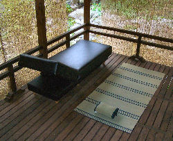 ↓ 壁はなく、すだれのようなものだけの「くつろぎ場所」? | ↓ 内風呂までの廊下。屋根はあるが外と同じだ。 |