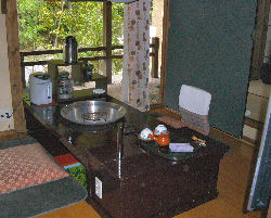 | ↓ 「居間」に相当する場所。コーヒーメーカーがあり、 ちゃんと豆やミルもある。 |