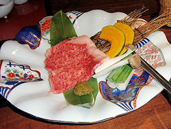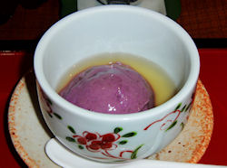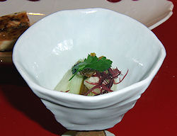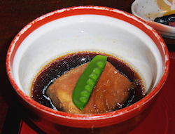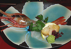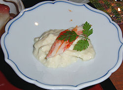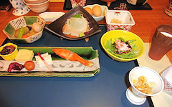 | 上段左から、湯葉ずわい蟹内子のせ、刺身(オホーツク産ぼたん海老・小樽産ヒラメ薄造り・様似産つぶ貝)、紫芋石垣蒸し 銀餡、白老黒毛和牛陶板焼き 下段左から、タラバガニとマスカルポーネチーズ テリーヌ風 バルサミコソース、長芋わさび漬け、サンマ サフラン揚げ オイスターソース風味、油坊主濃い口八方煮 この他に、食前酒(梅酒)、前菜(ホッキ貝ペペロンチーノ・鮎甘露煮・イカたまり醤油漬け・焼き栗・花蓮根)、ご飯、味噌汁、漬け物、デザート(メロン・くず餅) |