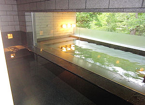 テルの本領発揮だ。まずは湯上がりのビール。フロントの横にバーがあって、そこで好きなものを飲める。ここではとりあえず小樽地ビールを2杯飲みんだ。 いったん部屋に戻って少し休むと、夕食の準備ができた、とお迎えが来る。よくある「食事処」での夕食で、テーブル席で落ち着いて食べることができた。口コミで「あまり北海道らしさがない」というようなことが書かれたものもあったが、自分は北海道民だからそんなことは期待していない。どれもなかなか美味しい料理で満足できた。ここでも飲み物は無料。ドリンクメニューがあり、ワインのフルボトルや焼酎などけっこうな種類があったが、それら全てに値段が書かれていない。どれを頼んでも無料なのだ。とりあえず白ワインのハーフボトルを飲ん | ![]() ↑ 大浴場 手前に内風呂、奥に見えるのが露天風呂 |