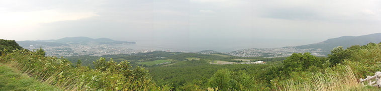 | 経由を指定してくる。別ルートを探しても生きたい道が出てこないので、仕方なく強制的にルートを作成して向かうことにする(道を知っているならナビを設定しなくても良いのだが、一応ホテルを到着地にするため)。前回キロロリゾートに行ったときに通った「毛無山峠」からの小樽の景色が素晴らしいのだが、前回は初冬で寒かったので再挑戦、なのだが今日はあいにく天気が悪い。おかげで下のような写真しか撮れなかった。 ↓ 毛無山峠展望台からの景色。青空だったら… |
