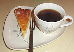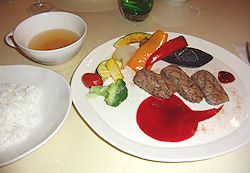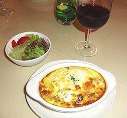 ワインフルボトル1本サービス、というプランで、ステーキメインのミニコース料理だ。特別豪華というわけではないがなかなか美味しかった。ブルーベリー系のステーキソースは斬新で、ご主人が作り方を詳しく説明してくれた。食後のデザートとして出たチーズケーキは妻が絶賛していた。 ← じゃがいものグラタン・サラダ・ワイン ↓左 ステーキ・スープ・ライス 右 コーヒー・チーズケーキ |