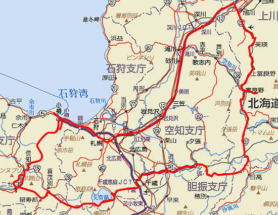 | いようだった)。しばらくぶりだったので、昔の教訓である「2人で頼むときに両方セットにするとポテトが多すぎる」を忘れてセットを2つ注文してしまった。 千歳からは少し楽しみがある。道東自動車道の夕張側はまだ走ったことがないのだ。あと1ヶ月ほどで帯広側とつながるので、その前だというのは残念だが、今回2つめの新規ルートだ。千歳ICから道央道に入り、千歳恵庭JCTから分岐。走っている分には特別変わったこともないのだが、走ったことがない道を走っているという充実感はある。そうはいっても高速だからあっという間に夕張ICに到着し国道274号線に。実はこの区間も走ったことがないのだ。そんなわけでひたすら走り続けて占冠の道の駅に到着。今日ここまで走って、5つめの道の駅だが寄ったのは2カ所目だ。しかし今回もトイレだけで、すぐに富良野に向かう。 |