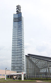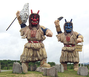 あり、入りづらく出づらかったのだが、食べ終わって道路に戻るとき見ると向かい側にモスバーガーがあった。しばらく食べていなかったのでモスバーガーの方が良かった。左側で便利だったし、残念。 しばらく走ると左手に何やらタワーが見える。近くに行ってみると道の駅にくっついて「ポートタワーセリオン」という名前の秋田港のシンボルタワーのようだ。高い建物には行ってみる、という行動パターンで、展望台に行くのが無料だったので迷うことなくエレベーターへ。華厳の滝の時に見たような、メートル表示のエレベーターで、100mが展望フロアーだ。あいにくの天気であまり綺麗ではなかったが眺めは素晴らしい。 このあとは海に沿った道路を走り、国道101号線に合流して少しの所で巨大ななまはげに出会った。ガイドブックには出ていたのだが、全然違う場所を想像していたので突然で驚いた。しかしあれだけ大きいと全く予備知識を持たないで走っていても見逃すことはないだろう。さっそく車を停めて(大きな駐車場がある)写真を撮っていたらどんどん人が増えてきた。写真を撮るという点から言えばタイミングが良かった。このなまはげだが、写真では大きさがよくわからないと思うが、近づいていくと人間は藁の長靴よりも小さいなのだ。右のなまはげの足の間をまっすぐ立ったままくぐることができる高さだし、手前に転がって |