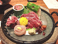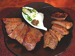 | が、あんな天気にもかかわらず湖水が青いことに驚いた。天気が良かったらどれだけ青いのだろう、とても心残りな感じで田沢湖を後にする。この後は今日の宿泊地である盛岡まで一気だ。 今日泊まるホテルも大浴場付きだ。駅前にあるということで混雑を予想したが、どうやら盛岡は駅を中心として発展している街ではないようだ。チェックインしてから少し休んで、いつも通り夕食に出かける。これもガイドブックで調べてあったJAZZが流れてワインを飲むという雰囲気の店へ。場所的にやや曖昧だったが、それほど大きな都会ではないので比較的簡単に見つかったが、予想に反してとても広い店だった。時間的に早かったこともあり、最初 |