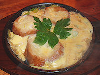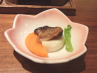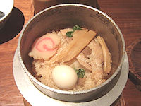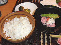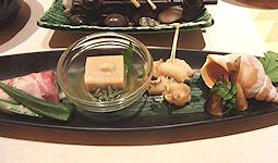 | 写真上段左から 先附(田楽)、先附(鰊の山椒漬け)、向附(鯉・鮎・馬刺し叩き・季節の野菜)、メイン(焼きたらば)、メイン(牛すき焼き) 中断左から 揚物(岩魚姿揚)、蓋物(鯉の旨煮)、凌ぎ(手打ちうどん…本来は石挽き蕎麦)、食事(会津ラーメン釜飯)、香の物(三五八漬) 下段左から 止椀(会津の小づゆ)、水菓子(柚シャーベット)、前菜(鮎山椒煮、アスパラベーコン巻き、手長海老唐揚げ、胡麻豆腐、青つぶ貝) |