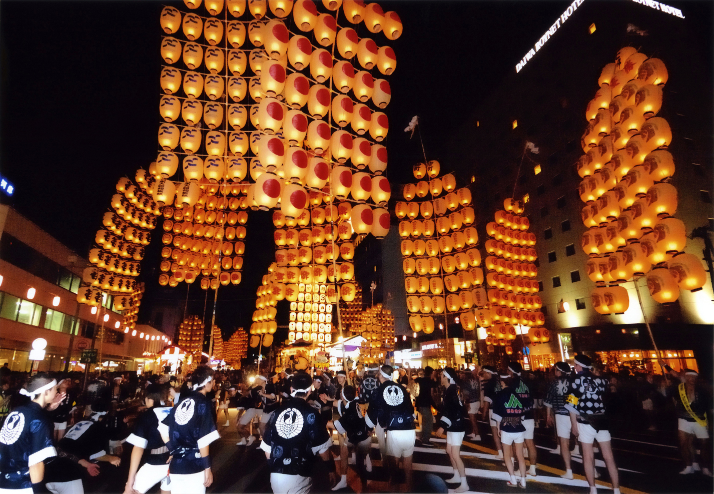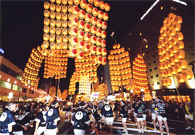| カーの営業所の人が「一般道でもすぐ着きますよ」と言うので、一般道を使う。今回の旅行で今日が唯一の土日半額の日なのだが、高速を利用しないということになった。竿燈祭りだから市内に入ったら渋滞を覚悟していたが、それほどの渋滞でもなくスムーズにホテルに着くことができた。ホテルはさすがに混んでいて、入った部屋も狭いものだったが仕方がない。大浴場が付いているのがせめてもの救いだ。夕方近くに到着する日なのに、いきなり今日が今年の旅行のメインイベントだ。 |