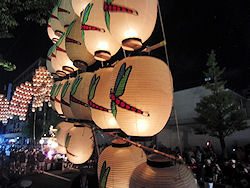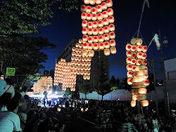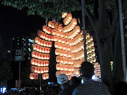 くらいの区間が中央分離帯を挟んで片側60くらいのブロック(全部で126ブロック)になっている。その半分以上は4段のひな壇になっているから相当の人数が収容できると思うが、いわゆる歩道の方にも人がたくさんいるからかなりの人出だ(こちらは席は設けられていない)。 けっこう暗くなってきた頃、我々が座っているブロックの近くの横道から続々と竿燈が入場してきて期待が高まる。中央分離帯を挟んで両側だから、1.8kmくらいの通り |