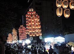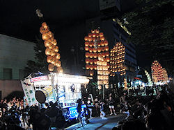 | ホテルから竿燈祭りの会場まではさほど遠くなく、散歩がてら歩いて行った。時間的にも早いのでまずは腹ごしらえということで「稲庭うどん」の専門店へ。予約なしで5分程度待ち、相席だったが比較的早く座って食べることができた。まずは冷たい生ビールを飲んで、冷たいうどんを食べて、ちょっと日本酒も飲んで祭り会場へ。広場では出店もたくさん出ていて、まさに「お祭り」というムードだ。竿燈が出てくる道路にはまだ車が走っていたが、中央分離帯のあたりには4段のベンチが準備されてい |