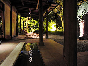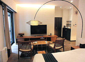 | が、この部屋からは角度の問題で滝は見えない。大浴場側は滝がライトアップされていて、その明かりがちょっと見える程度だが、雰囲気だけはある。丸い陶器の風呂は結構大きく、足を伸ばしてゆったりと入ることができる。虫などもいなくのんびりと時間をかけて入った。 風呂に入るとまた飲み物が欲しくなるが、部屋の冷蔵庫にはほとんど飲み物が入っていない。にもかかわらず自動販売機は大浴場のフロアに行かなければないというのがとても不便だった。ああいう部屋なのだから冷蔵庫にはもう少し入れておいて欲しかった。最近泊まる高級なところでは冷蔵庫の中は自由にお飲み下さい、というところも多く、一昨日泊まったところもそうだった。まあ、そんな不満も少しはあったが大きなベッド(ダブルベッドが2つくっついて並んでいる)でゆったりと寝ることができた。 |