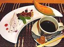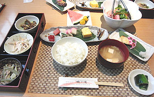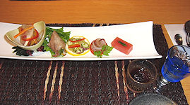 | 風呂から上がったら早めの夕食だ。部屋はオートロックだから、料理を持ってくるたびに鍵を開けるのは面倒だと思っていたら、合い鍵で勝手に開けて入りますとのことで、まさしく「御食事処」という雰囲気だ。食後のビールに続いて出てきた料理はとてもたくさんあり、最後はもう食べきれないほどだったが、どれも美味しく満足できるものだった。 部屋のバルコニーにある露天風呂→ |