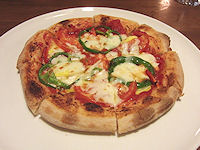![]() 写真上 左からフレッシュトマトのバジルソース ヒラメのカルパッチョ 海老のガーリック焼き 下 左からミックスピザ 桃とベーコンの冷製スパゲッティ 白ワイン(全て正式名称は忘れた)