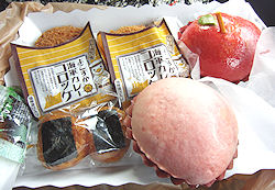 | さて昼食だが、結局食べそびれるという感じになってしまったが、駐車場の所にあった店でちょっと変わったあんパンと「もちプリン」を買って食べることにした。ちょっと足りないが夜に備えて控え目にしておこう。ということで車の中で淋しい昼食を済ませて、高速で一路仙台へ。仙台の一番の目的は松島だが、今日は七夕祭りの最終日だ。小学校の頃に一度見たことがあるのだが、その時はあまり感動はしなかった。今回はどうか。 | ↓ 左 ちょっと変わったつぶあんぱん 右 まだ凍っている平泉もちぷりん