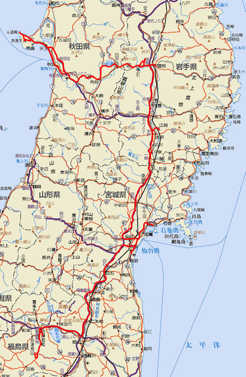 千歳−秋田間の飛行機はとても小さく、何と50人乗りというバスに毛の生えた程度の大きさだった。こんなに小さな飛行機は初めてだったが、それでもジェット機で、天候にも恵まれたのでほとんど揺れもなくなかなか快適な乗り心地だった。 秋田空港に到着後すぐにレンタカーを借りて市内へ。高速を使おうと思っていたが、レンタ |