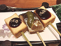 | 写真上左から 店員を呼ぶときに使うでんでん太鼓、本命のトロ牛タン焼き(みそ味・しお味) 写真下左から トロ牛タンのにぎり寿司、茄子焼きの冷製、あぶら麩の卵とじ、横手焼きそば