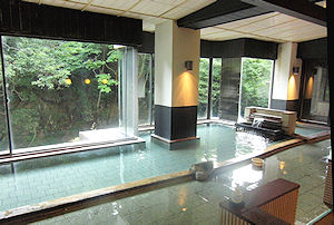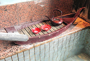 にした。洗面所・シャワーブースを通って広いバルコニーに出ると露天風呂がある。ここは後でゆっくりと入ることにしてまずは大浴場へ向かった。ここの大浴場は滝が見える。内湯は見えるだけだが、露天風呂に出ると迫力ある音も聞こえて、他にはなかなかない大浴場になっている。そして、先ほども書いたが大浴場の隅にはちゃんとお酒が置いてあった。確か前回来たときは浴場には行ってすぐの所に堂々と置かれていたはずだが…。実は脱衣所にはどこの風呂でも書かれている「お酒を飲んでの入浴は危険です」という貼り紙があってやや矛盾している感もあるが、大量に飲むわけではないから問題なし、ということなのだろう。ちなみにこのお酒は朝風呂にも置いてあり、まさしく「小原庄助さんの唄」そのものだ。こんな宿は他にはないだろう。 | |