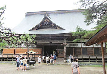 8月9日 今日も残念ながらスカッと晴れた天気にはならないようだ。松島観光だから青空を期待したのだが…。 ここの朝食バイキングは郷土料理もあるとのことだったが、気分的に洋食だったので笹かまぼこだけ食べて、あとはいつもの朝食だ。朝食会場はフロントの階だがここは7階だ。こういう景色での朝食も悪くない。 いつもなら左の写真はホテルの写真だが、昨日の所に書いたように、道路を歩いていると看板らしきものが良く見えなく、結構離れないと全景が取れそうにないので、わざわざ1階まで降りていくのも面倒だということもありやめにしたのだ。 松島湾遊覧船乗り場をナビに指定すると途中から高速を使うように表示された。その気はなかったのだが、面倒なのでいわれる通りに走ることにした。遊覧船乗り場には10時少し前に着いて、10時半の船に乗ることにした。時間があるので五大堂に寄っていると、桟橋にはもう船が泊まっていて人も並んでいる。座れなかったら困るので急いで船に向かった。幸いまだ早いほうで、我々が乗ってから続々と人が集まり、最後の方の人は明らかに座れない状況だった。どうも今回の旅行は我々が行った後に人が集まってくるパターンが多いようだ。遊覧船はというと、空も青くないし(暑いが)、島もたくさん見ていると同じような感じになり思ったほどの感動はなかった。 船を下りてすぐ前にあった店で細々としたお土産を少し買って、そのまままっすぐ瑞巌寺に行く。参道の入口で係っぽいおばちゃんが、「どうせなら右側の道を行った方がいいよ」と言うのでそちらを歩いて行くと、そこは「瑞巌寺 |