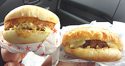 ↓昼は軽めにハンバーガー(右)とコロッケパン(左) ![]() |
