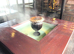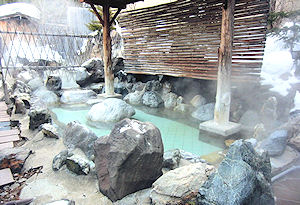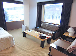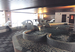 | 普通の広さ・装備の部屋だ。ただ、設備がやや古くなってきているこのホテルの中で、数少ないLAN完備の部屋というところがプラス評価だ。ただし、洗面の方のブラインドがおかしかったり、その部分がとても寒かったり、暖房の送風がうるさかったりと、全体的には部屋の評価は低かった。ただ、爪切りや裁縫セットがあっったり、胃薬が置いてあったりという細やかな配慮ができているのが老舗ならではかもしれない。まあ、そんなわけで部屋についてはプラスマイナスゼロというところだ。 さて、チェックイン後はさっそく温泉だが、鶴雅館の方の大浴場は以前からあるもので変わっていないので、飛翔館の方に行ってみることに。こちらは男女入れ替えではなく2階と3階に分かれている。3階の方が男性用だが、同じフロアに岩盤浴がある。有料だが500円と安く、時間に制限もないので他のホテルに比べて割安感がある。しかも女性専用の高温、男女共用の高温と低温という3種類あり、広い休憩所には水分を補給できるようにレモン水などが用意 |