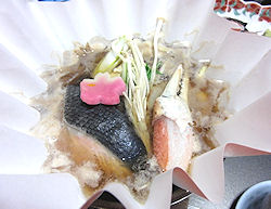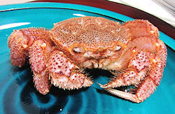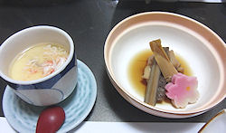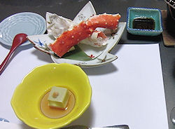 | 今日の夕食は御食事処でのコース料理。メインを「毛蟹の石子鍋」と「石焼き牛ロース」のどちらかで選ぶのだが、それぞれ一つずつという希望を出していて、その通りにしてくれた。 ↓ 生きている毛蟹(クリックすると動画) | |