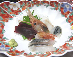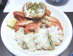 写真 上段左からタラバ蟹足と不明な豆腐 寄せ鍋、蟹の爪が入っている 刺身5種類、茹であがった毛蟹 下段左から蟹茶碗蒸しと煮付け 海老天丼、海老天茶漬け これ以外にも数品あり、お品書きがないので不明なものもある |