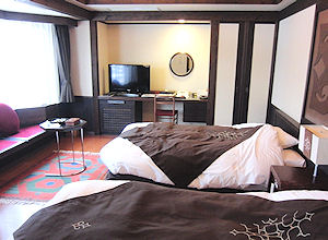 たが、やはり野中温泉までしか行けなかった。どこにも寄らないで来たために予定より早く2時に着いてしまったが、チェックインの手続きをしてくれたので(部屋に入るのは3時くらいからとのこと)、ホテル周辺をブラブラ歩いて喫茶店でコーヒーを飲んで時間をつぶした。しかし、あとから考えてみるとホテルのロビーに無料のお茶などが用意されているのでそこにいた方が良かったかもしれない。 今日泊まるのは鶴雅グループの総本山とも言えるホテルで、隣のホテルを買い取って改装し、1階をつないでしまうという荒技で大きくなった「鶴雅ウィングス」だ。昔からある、いわゆる本館が「鶴雅館」そして「別館」、新しく改装して接続した方が「飛翔館」という。予約したのは「鶴雅館」で、「レラの館」というアイヌ系の雰囲気にした部屋だ。別棟ではないが、自動ドアで仕切られて、その一帯は裸足で行動するようになっている。部屋に向かう廊下の途中には足湯まであって、高級なのかと思いきやそうでもなく、ごく |