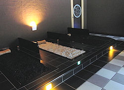 ↓ 左から 男女共用低温岩盤浴(椅子席もある) 岩盤リビング(飲み物がある休憩所) クールルーム(クールダウン用だが寒い)
