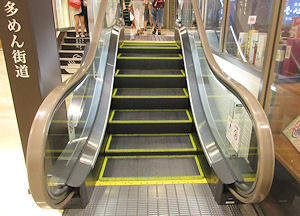 5段くらいしかない珍しいエスカレーターと「博多麺街道」入り口の看板 → |