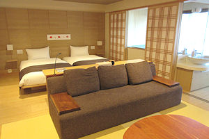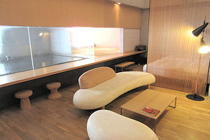↓ おしゃれな部屋。奥はベッド。左側が温泉で、その温泉側から部屋を見たのが右の写真。一番奥の小上がりの意味が不明だ。 |