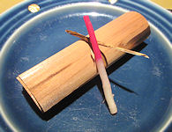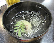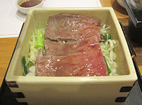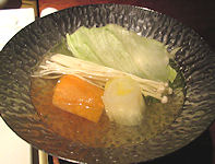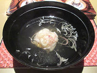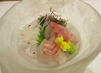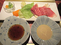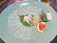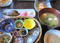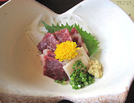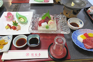 | 熊本では必ず「馬刺し」が出て、妻が食べないので私が2人分食べる。私も普段はほとんど食べないが、熊本の馬刺しは美味しく食べることができる。お腹がきつくなったので、ご飯はおにぎりにしてもらったのだが、食べ終えて部屋に戻ったときにはすでに置いてあった。こういうサービスはなかなかだ。ちなみに、ここでは焼酎が安く、1合単位で注文するのだが、普段飲まないような高価な焼酎がおしゃれな竹の器に入ってきて、この点は大変満足だった。 | ![]() |