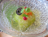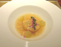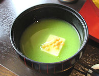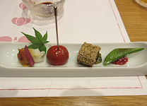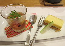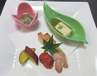 | 写真 それぞれ左から 上段 前菜(印鯒煮凍り 鶏と冬瓜の餡) 吸い物(鱧葛打ち 焼茄子) 刺身(ヤスミ洗い)・甘エビカクテル 中段 焼物(平目杉板焼き) 鍋物(佐賀牛ロースの嬉野茶しゃぶしゃぶ) 左が具材で右が鍋 下段 嬉野産ひのひかり・味噌汁(赤出汁) デザートで紅茶(嬉野茶)を選ぶ 選んだ紅茶 コーヒーとデザート (白桃デニッシュのアイス添え) 最下段 利き酒セット グラスの下に銘柄名の札がある 1セット3種類で1合以上ありそうだ |