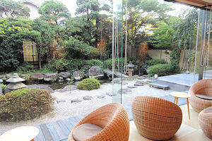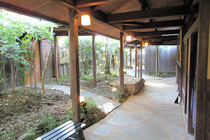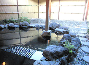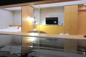 | 今日のホテルは和風旅館という感じだが、その中でデザイナーズルームのような部屋を予約してある。部屋の中に大きな御影石の温泉が付いていて(露天ではない)、部屋との間はガラスで仕切られている。宿自体はなかなか複雑な造りで、大きな宿ではないのに部屋に行くまでに何度も曲がらなくてはならない。そして、何とここにはエレベーターがない。行動範囲は狭いから階段でも良いし、チェックイン時は運んでくれるからいいが、チェックアウトの時は大きな荷物を持って階段というのはいかがなものか、と感じた。 |